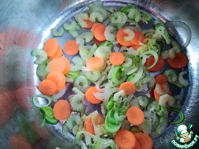 Добавляем морковь и сельдерей. Жарим пару минут.