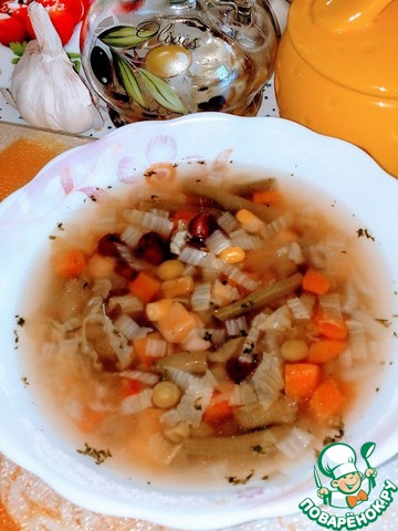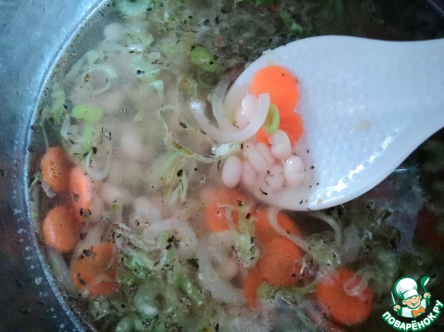 Добавляем фасоль и бульон. Варим до готовности фасоли. Солим, перчим, приправляем травками.