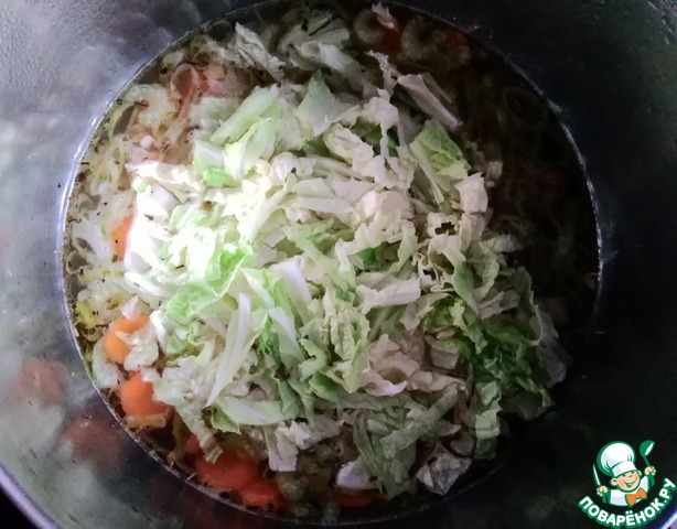 Кладем пекинскую капусту и убираем суп в духовку, разогретую до 180°, на 15 минут.
