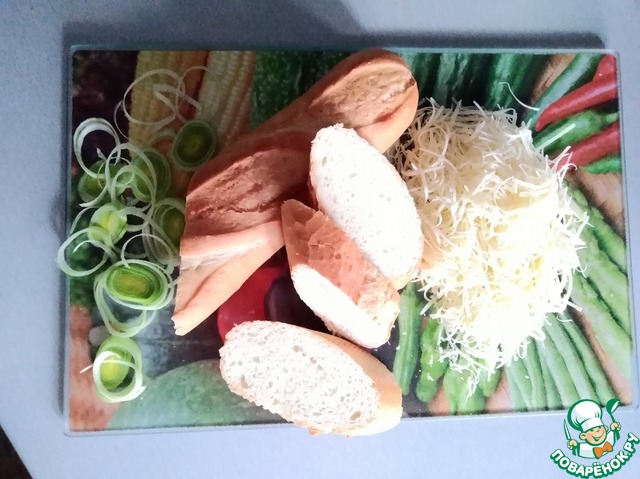 Режем багет (не тонко). На кусочек, сбрызнутый маслом (лучше оливковым), кладем колечки лука-порея, посыпаем сыром и немного травами. Тоже отправляем в духовку до расплавления сыра.