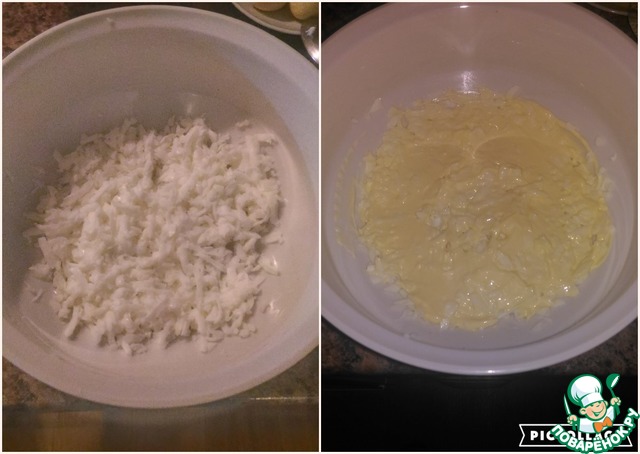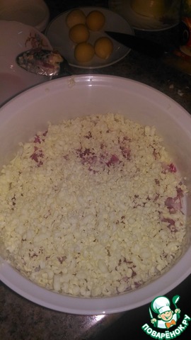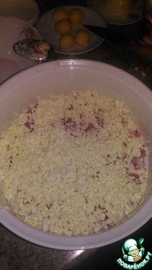 Белки отделить от желтков, натереть на крупной терке, разровнять смазать майонезом (без фанатизма, но и не жалея).