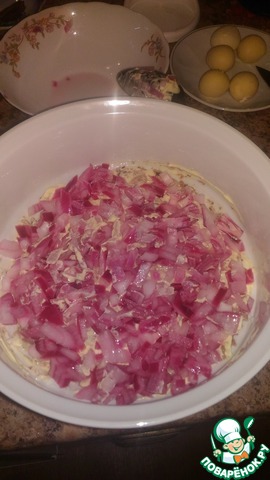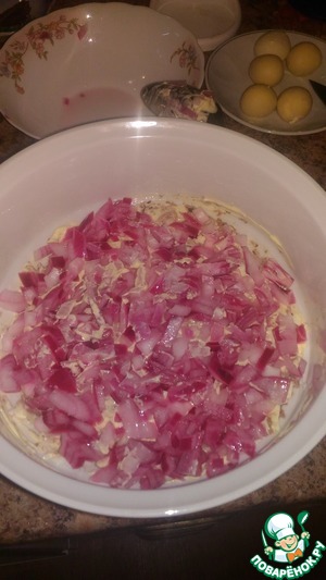Выложить слой маринованного в уксусе лука. Лучше использовать салатный, он придает менее резкий вкус.
