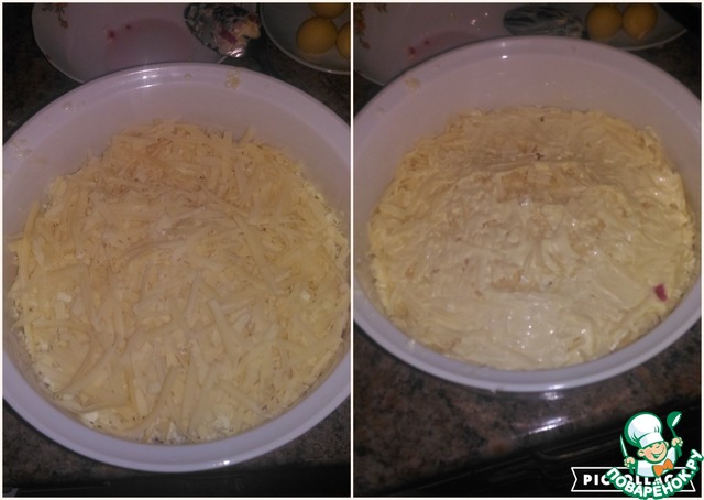 Слой сыра (натереть на крупной терке), промазать майонезом.