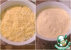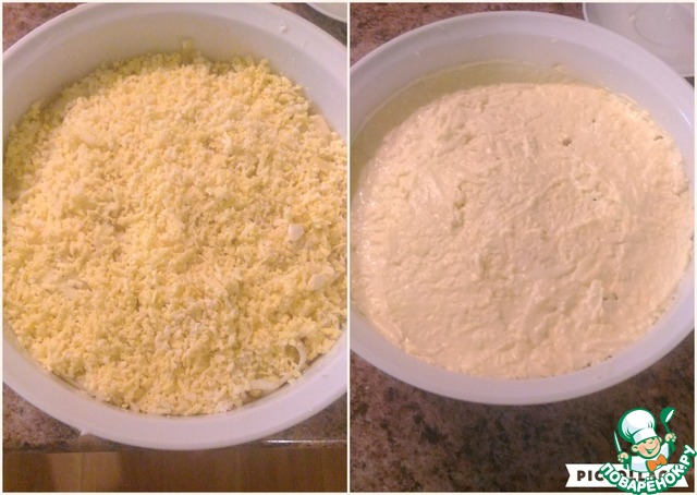 Натереть желтки на мелкой терке, разровнять, сверху промазать майонезом.