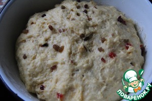 После того, когда тесто поднимется в первый раз, обмять его и добавить цукаты и изюм. Вновь оставить для второго подъема.