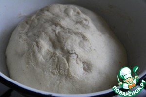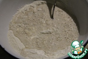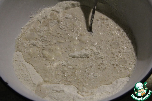 Замесить тесто. Муку сразу всю не высыпайте! Один стакан добавьте по мере замеса, чтобы не сделать тесто крутым.