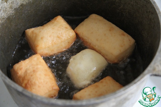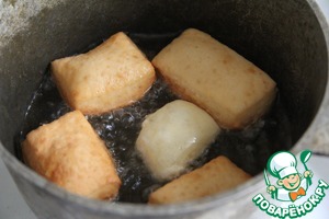 Растительное масло нагреть и жарить пончики до золотистого цвета.
