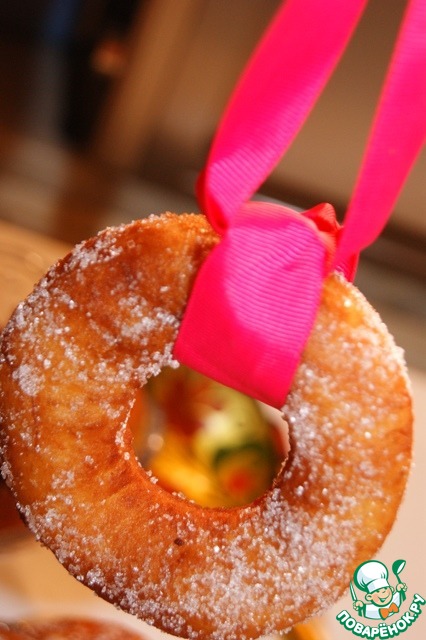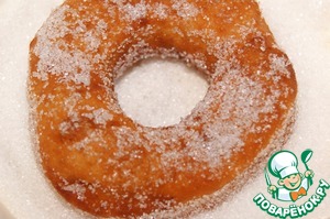 Готовые пончики остудить и обвалять в сахаре. Если сахар плохо прилипает к поверхности пончика, то можно совсем слегка (из распылителя) сбрызнуть его цветочной водой.