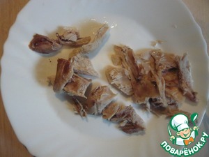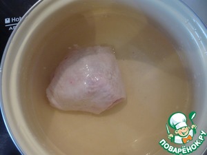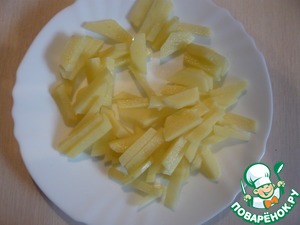 Картофель режем брусочком. Бедрышко достаем из кастрюли. В кастрюлю закладываем картофель. Варим 15 мин. после закипания.