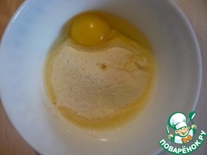 Пока курочка варится готовим лапшу. Смешиваем яйцо с манной крупой и солью.