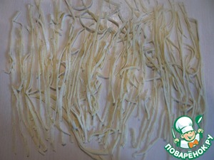 Нарезаем лапшу. Лапши получится больше, чем нам требуется. Потому даем ей подсохнуть и в пакете убираем на хранение.