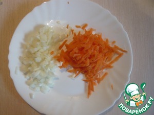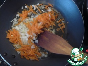 Пассеруем морковь с луком. Закладываем в бульон зажарку и 1/3 лапши. солим и перчим по вкусу. Варим 10 мин.