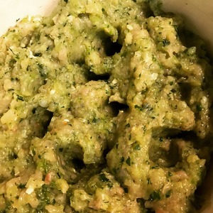 Прокручиваем фарш из всех этих составляющих. Добавляем 1 яйцо, соль, перец по вкусу и вымешиваем фарш.