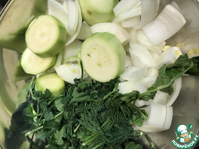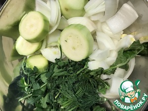 Почистим, помоем и порежем кабачок, лук и зелень.