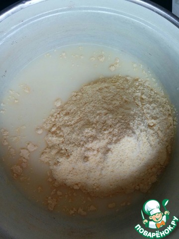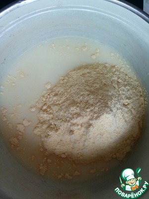 Подогреть молоко до теплого состояния. Добавить соль, сахар и всыпать кукурузную муку.