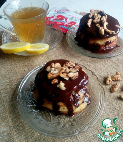 Подаем оладьи горячими, полив растопленным шоколадом и присыпав орешками. Можно подавать со сметаной или вареньем.
