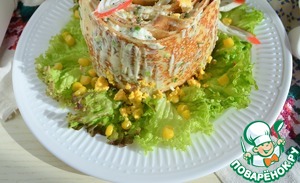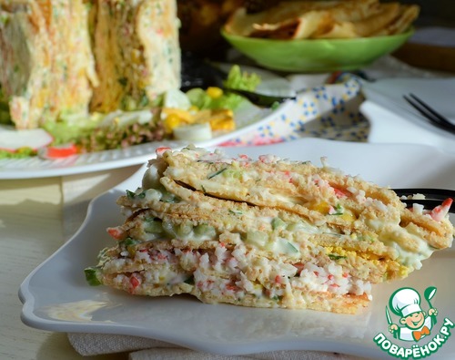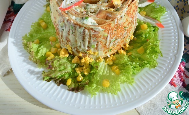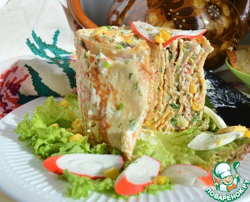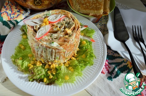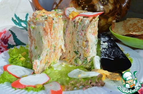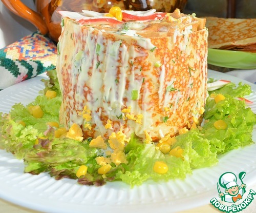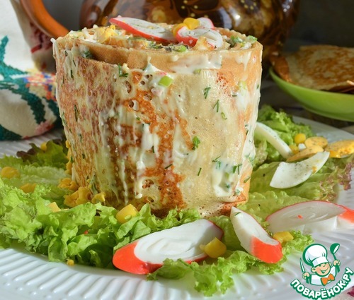Всем знакомый, многими любимый крабовый салат, но немного в другом виде. Так сказать, на праздник, на Масленицу. Угощайтесь.