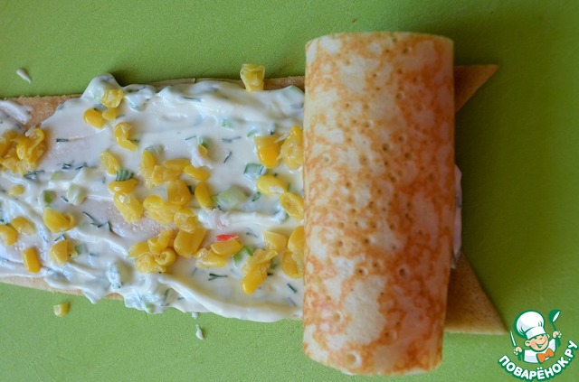 Две крайних полоски блинчика наложить полукругом внутрь,