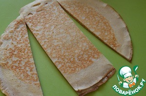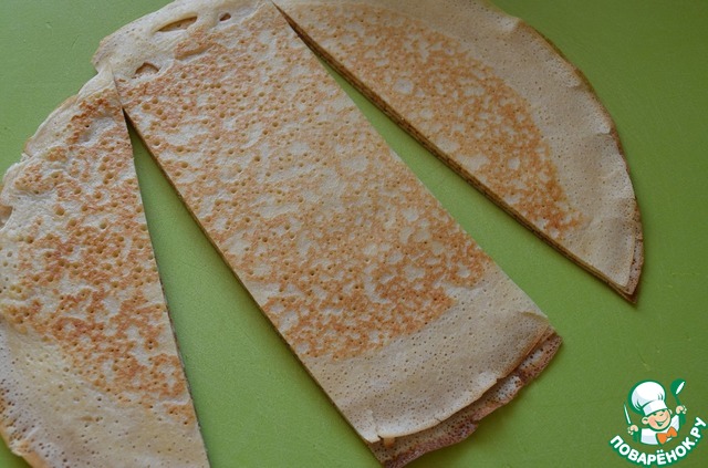 Разрезать блинчики на 3 части, серединка 8-10 см.