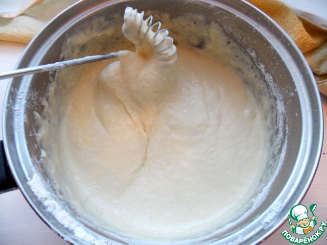 В другой чаше соединить молоко, яйца, масло, соль и сахар. Размешать, добавить муку и снова перемешать до однородной массы. Тесто получится густым.