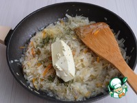 Добавить 70 гр. сливочного масла. Сковороду вернуть на медленный огонь и слегка протушить для полного расплавления сливочного масла. |