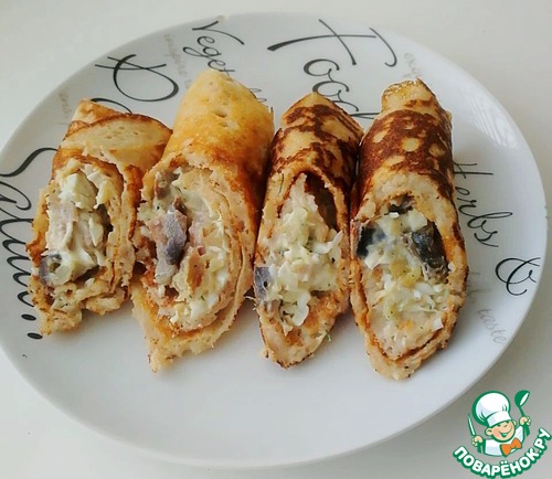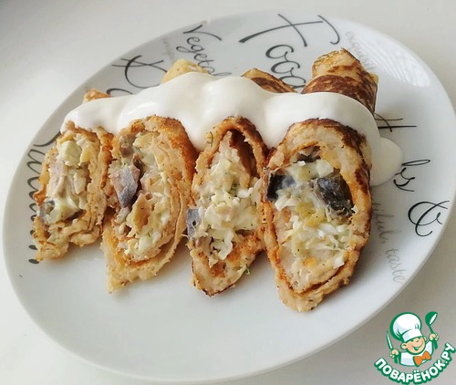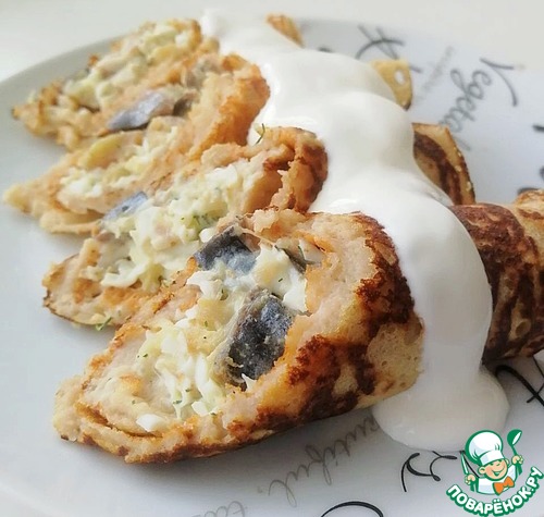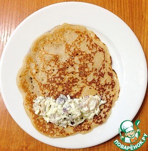 • На блин выкладываем начинку и сворачиваем рулетом. Дополнительно можно подать сметанку.