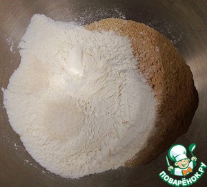 • Смешать оба вида муки, соль, сахар. Добавить молоко с дрожжами, желтки. Накрыть миску и поставить в тёплое место на 40 минут.