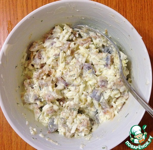 • Добавить варёное яйцо, тертое на тёрке, укроп и сметану. Перемешать.