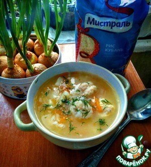 Всыпаем в кипящий бульон рис. Перемешиваем и варим 7-10 минут.