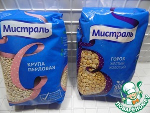 Горох и перловку я использую ТМ "Мистраль". Перед готовкой их нужно по отдельности замочить на 5-6 часов.