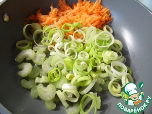 Морковь натереть на крупной терке, лук-порей нарезать колечками, сельдерей - небольшими кусочками. Подготовленные овощи обжарить на растительном масле, помешивая, 6-7 минут.