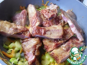 Ребра нарезать по одной косточке, добавить к овощами, обжарить 7-8 минут.