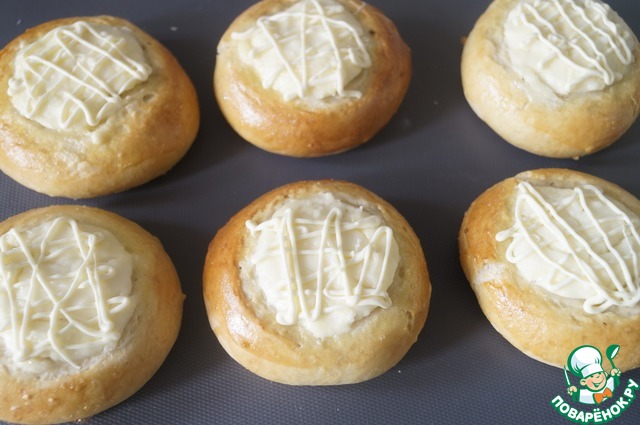 Готовые ватрушки остудить и сверху выдавить немного белого шоколада.