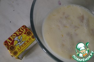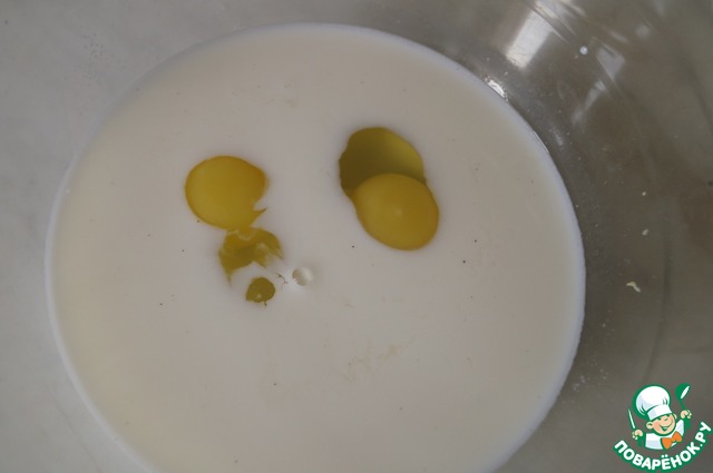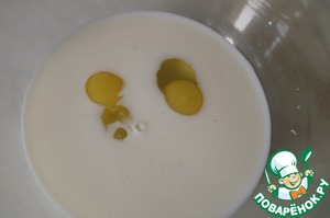 Для начала нужно приготовить тесто. Для этого в теплом молоке растворить сахар и соль. Добавить яйца, растительное масло и слегка взбить венчиком.
