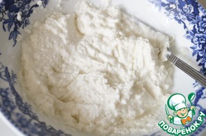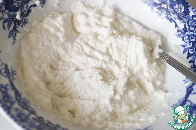 Пока тесто отдыхает, подготовим начинку. Для творожной нужно растереть творог с сахаром, ванилином и яйцом.