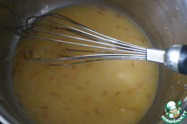 Для грейпфрутового курда отжать сок из грейпфрута и мандарина, вылить его в кастрюлю, добавить яйцо, сахар и крахмал, хорошо перемешать венчиков до однородного состояния. Поставить на плиту и варить постоянно помешивая до загустения. Затем снять с огня и остудить.
