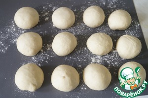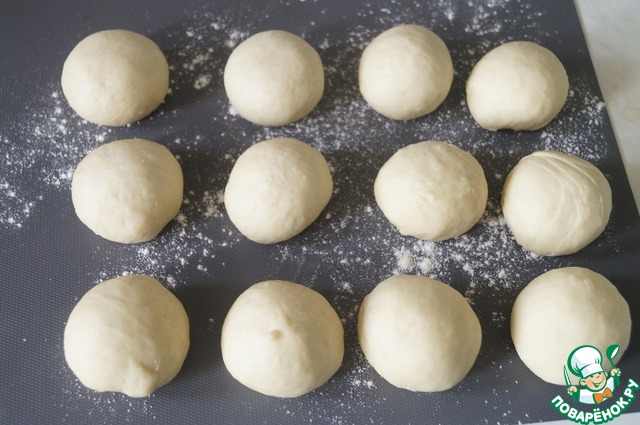 Готовое тесто разделить на 12-14 частей по 70 гр каждая. Скатать в шарики, накрыть полотенцем.