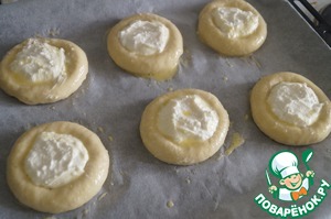 Выложить творожную начинку. Разместить ватрушки на противне, застеленным пергаментом, смазать их взбитым яйцом. Выпекать в разогретой до 180-190 градусов духовке, около 25-30 минут до золотистой корочки.