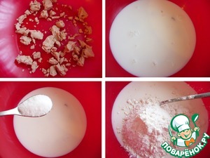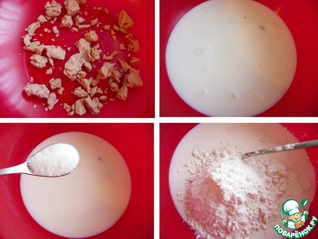 Для опары дрожжи раскрошить, залить тёплым молоком, добавить сахар и муку.
