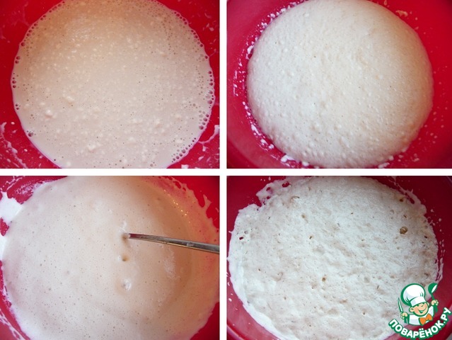 Опару подбить (перемешать ложкой) и оставить на второй подъем на 15 мин.