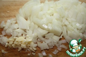 Режем лук кубиком и чеснок 1 зубчик мелко.