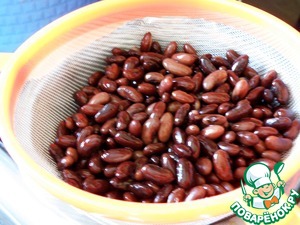 Замоченную фасоль слить, промыть и поставить варить в свежей воде почти до готовности. Не солить! Готовую фасоль откинуть на дуршлаг и ополоснуть водой.