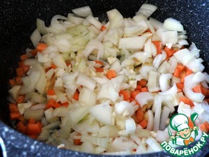 Овощи почистить, помыть и нарезать мелкими кубиками. Лук нарезать немного крупнее. Разогреть масло в кастрюле с толстым дном и пассеровать лук, чеснок, морковь и сельдерей до легкой позолоты, помешивая.