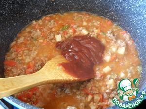 Добавить помидоры к содержимому кастрюли и тушить 10 минут. Добавить кетчуп и прогреть еще пару минут.