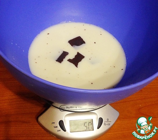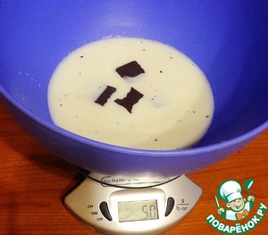 • Нагреть 200 мл. молока, всыпать кусочками шоколад, размешать до его растворения. Влить оставшееся молоко, добавить яйца, ванилин, сахар. Перемешать.