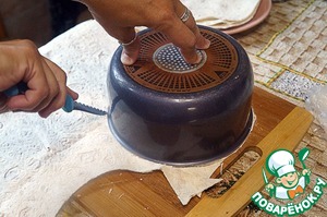 Взять емкость, в которой будете готовить торт (у меня – глубокий сотейник диаметром 22 см), вырезать из лаваша круги по диаметру емкости.