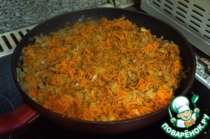 Добавить к луку морковь, присыпать зирой (можно зиру предварительно растолочь в ступке), перемешать, жарить на среднем огне до мягкости моркови. Остудить.