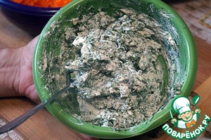 Смешать мягкий сыр, мелко порезанную кинзу и чеснок. Если есть желание, для мягкости можно добавить ложку майонеза.