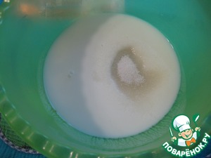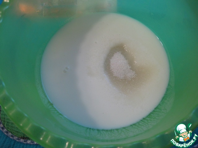 В миску налить кефир, добавить сахар