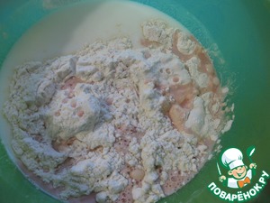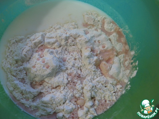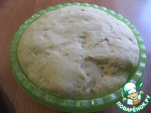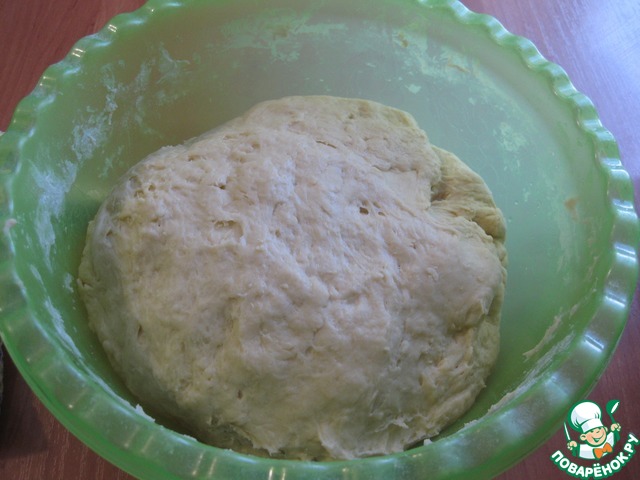 Всыпать муку и замесить мягкое тесто, - оно будет немного липнуть к рукам, но очень хорошо отходит от стенок миски, - убрать в теплое место до увеличения объема в 2-3 раза (примерно на час)